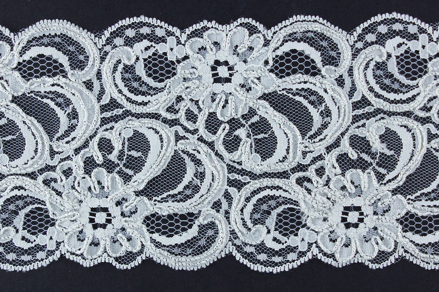 3 1/4" wide ivory Alençon lace; this is a galloon lace with a graceful floral pattern and embellished with subtle silver and ivory cording.