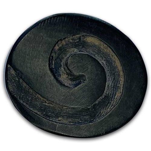 1 1/4" irregular horn button in deepest brown, engraved with a lighter spiral shape, and with a shank backing. Made in USA.