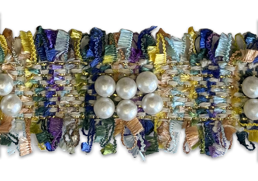 1 1/4" wide trim with rectangular clusters of pearls on a baby blue, lemon, plum, meadow green, beige, cobalt, and gold metallic band flanked by textured multi-colored fringe. This trim is perfect for sewing haute couture garments such as French designer-inspired jackets - layer your trims for a unique and special look! Made in France.