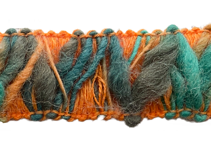 1 1/4" wide bouclé trim in tangerine with teal green and olive accents. This trim is perfect for sewing haute couture garments such as French designer-inspired jackets - layer your trims for a unique and special look! Wool blend. Made in France.