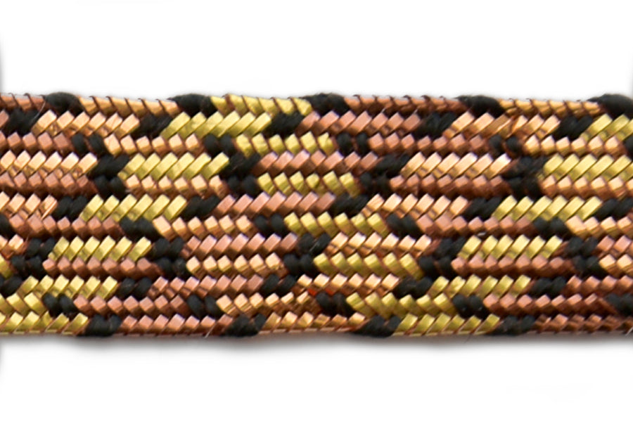 1/2" wide woven ribbon in a copper and gold metallic design, with a subtle black argyle pattern. LIMITED STOCK.