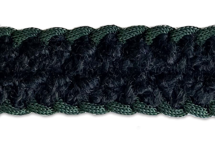 1" wide trim with a fuzzy jet black interior surrounded by forest green rope borders. This trim is perfect for sewing haute couture garments such as French designer-inspired jackets - layer your trims for a unique and special look! 100% wool. Made in France.