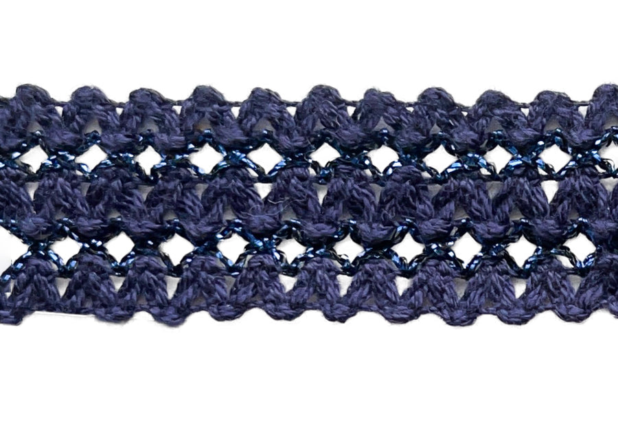 1" wide open-weave trim in an undulating, three-row Aegean blue design, with metallic blue accents. This trim is perfect for sewing haute couture garments such as French designer-inspired jackets - layer your trims for a unique and special look! Made in England.
