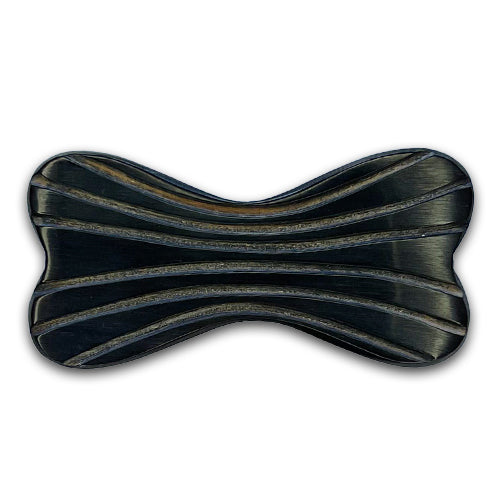 2" horn button in a distinctive dog biscuit shape, with engraved decorative lines, and in deepest brown. Made in USA.