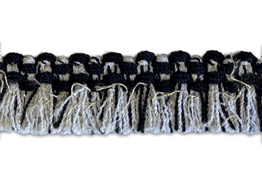 3/4" wide fringed trim in jet black and white, with subtle sparkling gold metallic accents. This trim is perfect for sewing haute couture garments such as French designer-inspired jackets - layer your trims for a unique and special look! Made in Italy.