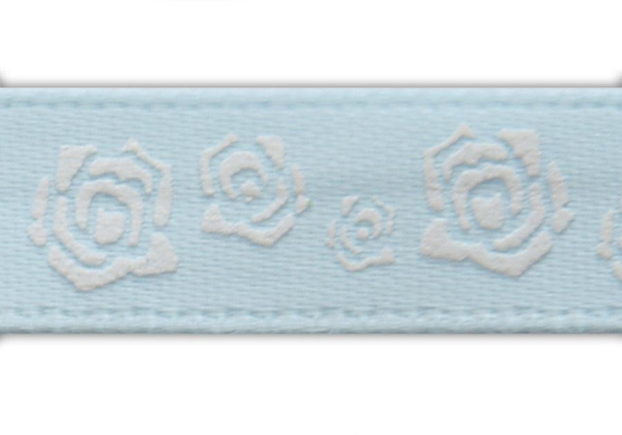 3/8" wide woven ribbon in a delicate baby blue and white rose design.