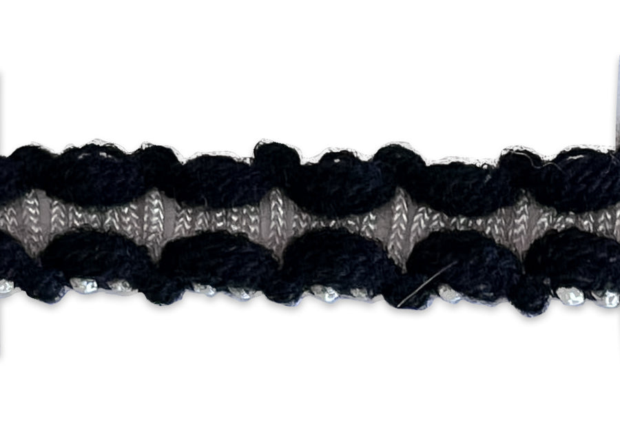 5/8" wide trim in a railroad design with silvery white ties bordered with fuzzy black rails. This trim is perfect for sewing haute couture garments such as French designer-inspired jackets - layer your trims for a unique and special look! Made in France.