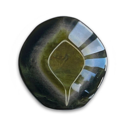 A 7/8" irregularly shaped plastic button in shades of moss green and with a richly colored center. Shank Backing. Made in Spain.