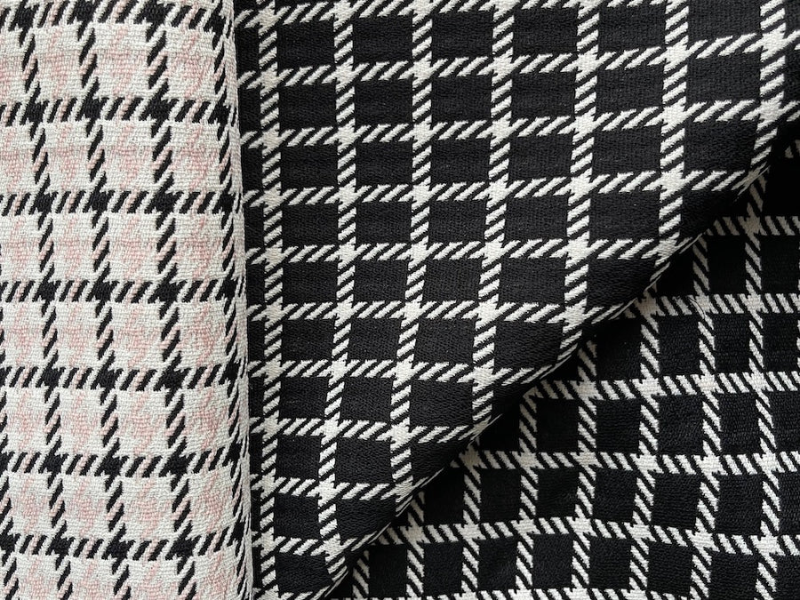 A heavy-weight, reversible viscose blend crepe suiting in a rosy blush pink, black and white windowpane check on one side, and a black and white windowpane check on the reverse - this stunning couture fabric is perfect for suit jackets, capes, slacks, or tailored dresses. Made in Italy. 86% viscose and 14% polyester. 54" wide.