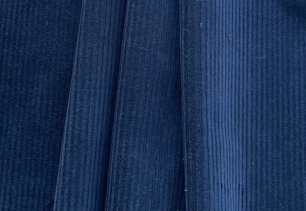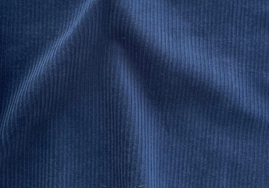 A high-end, mid-weight, stretch mid-wale cotton corduroy in brilliant admiral navy blue blue - with a touch of lycra for comfort, this buttery soft corduroy is perfect for sportswear, pants, children’s wear, blouses, or full skirts. Iron on the wrong side of the fabric and with the nap, or verso del pelo. A needle board can be utilized. Made in Italy. 98% cotton and 2% lycra. 55" wide.