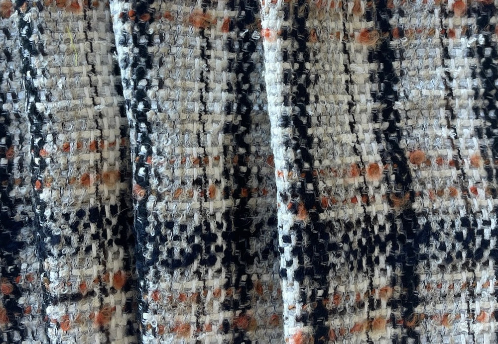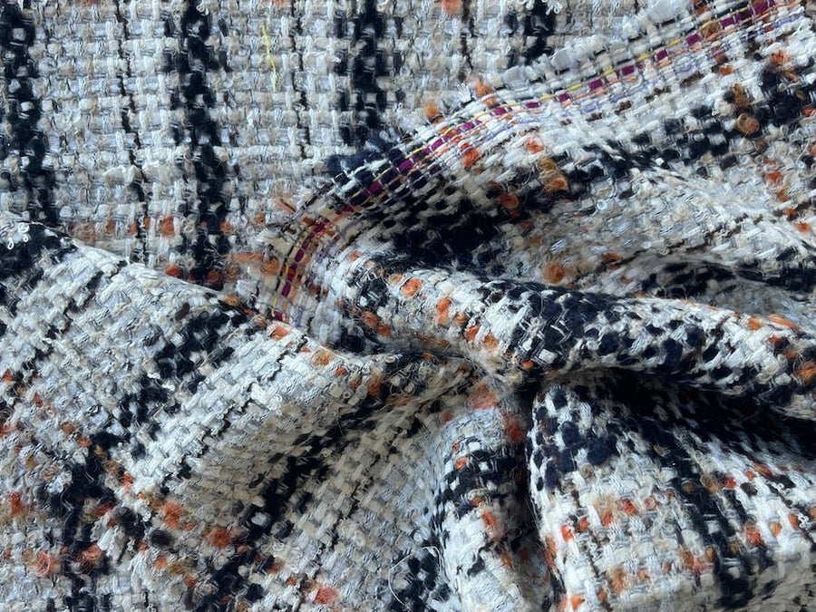 A mid-weight cotton blend bouclé larger-scale plaid in persimmon, iced cream, and onyx - with its delightful texture and elegance, this airy bouclé is perfect for a fabulous swing coat, full pants, or a tunic top. Made in Italy. 35% acrylic, 25% polyester, 20% cotton, and 20% wool. 60” wide.