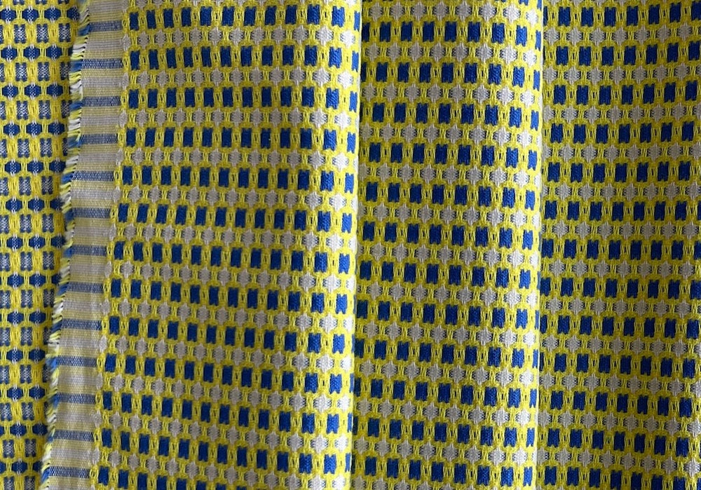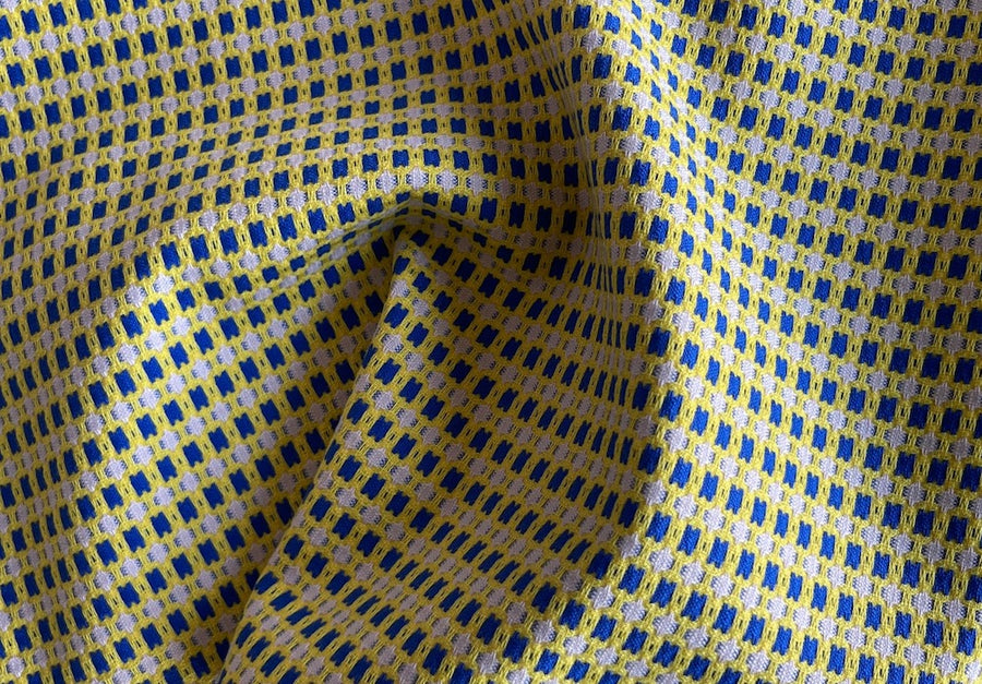 A mid-weight stretch cotton in a woven geometric grid in juicy lemon yellow, nautical navy, and white - this sporty stretch cotton is perfect for cropped pants, a jacket, or shorts. Made in Italy and used by Bonotto. 90% cotton and 10% lycra. 58" wide.