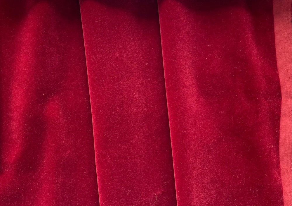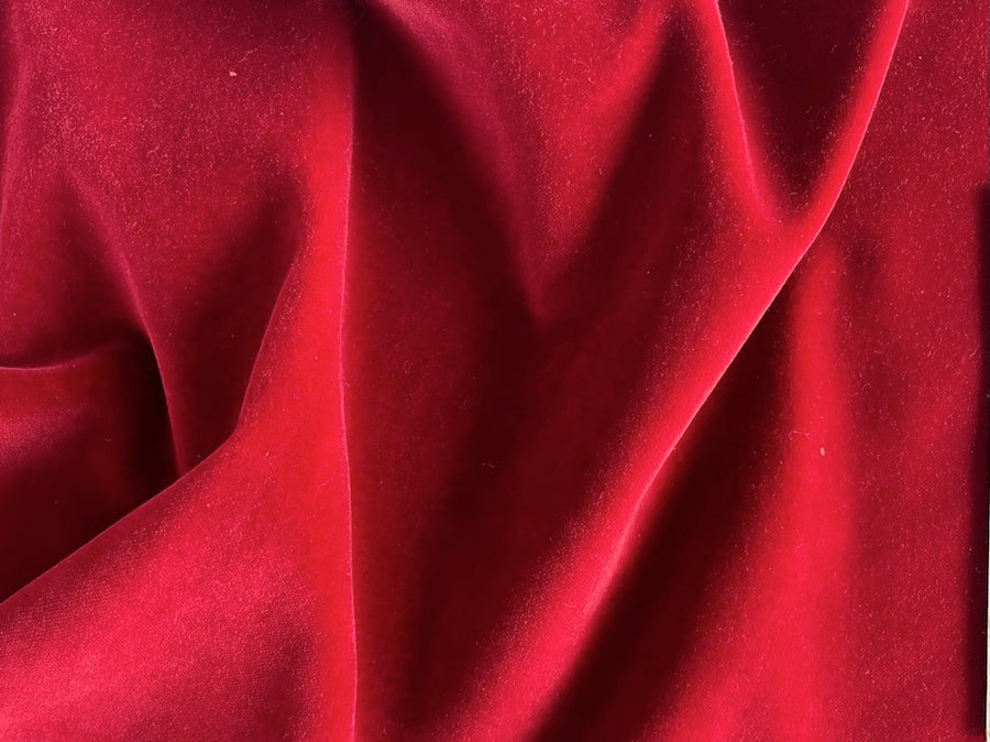 A plush, lighter-weight cotton velvet in brilliant holiday crimson red - this delicious, pettable velvet is perfect for jackets, accent pillows, needlepoint backing, or holiday garments or decor. Made in Italy. 72% cotton and 28% rayon viscose. 42" wide.
