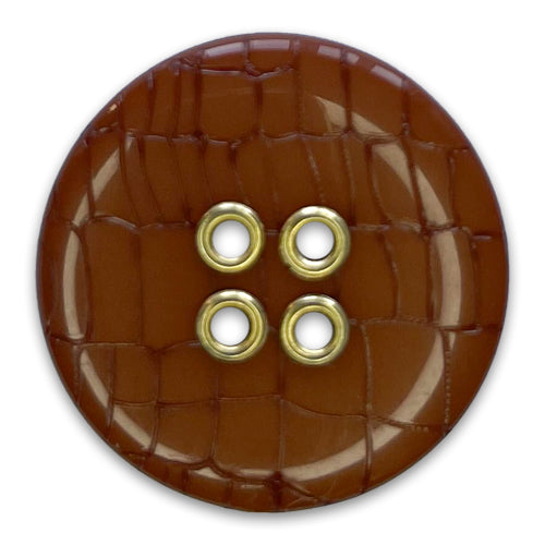 A  4-hole plastic button in a warm shade of burnt sienna, with an alligator texture, and gold metal eyelets. Made in Italy.