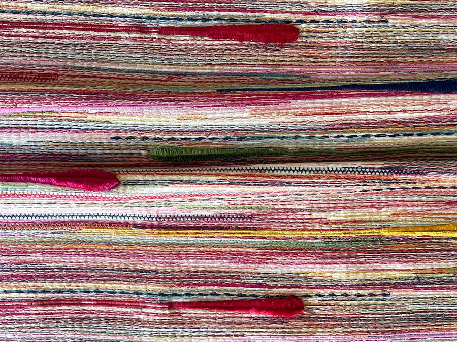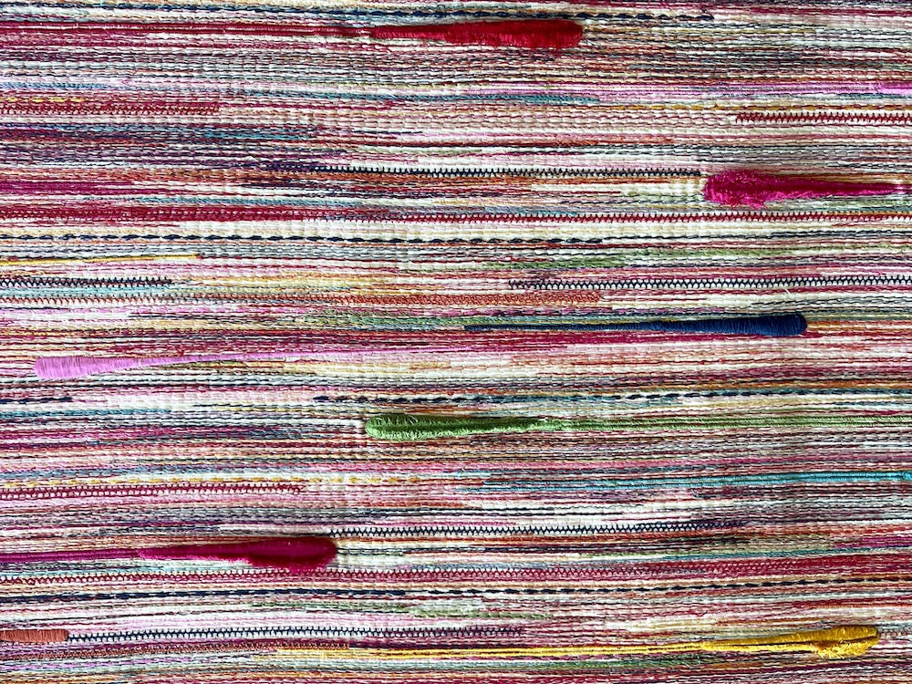 A cotton canvas with crosswise three-dimensional irregular striations in hot pink, teal, mint, yellow and turquoise on an ivory background - this joyous fabric would be handsome for upholstery, headboards, chairs, and ottomans. Cotton canvas base with polyester and rayon embroidery. 54" wide.