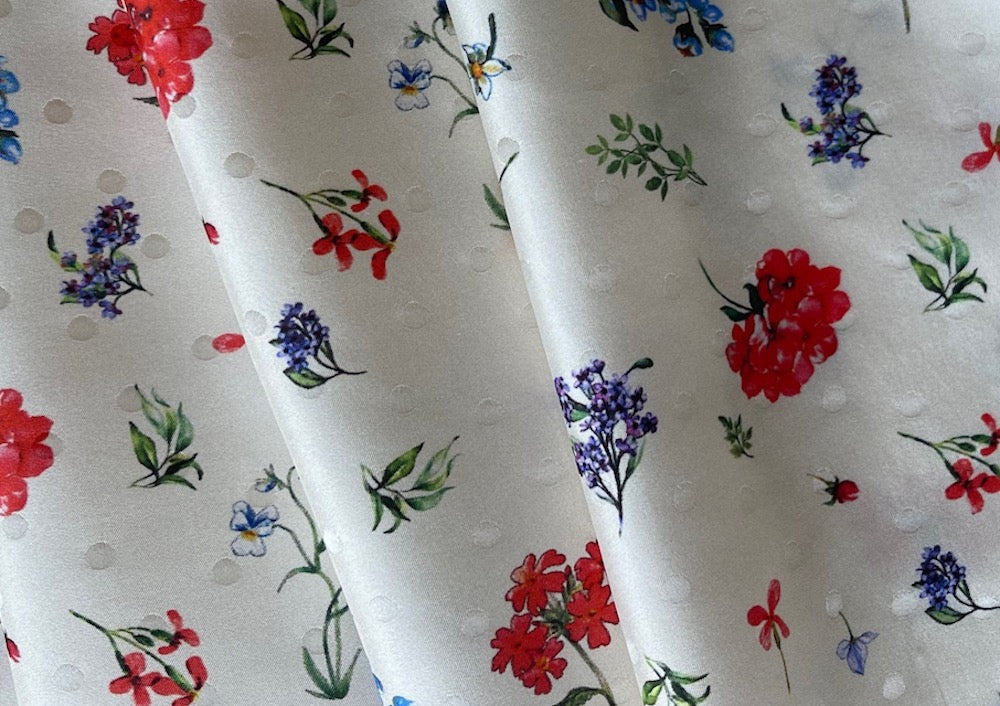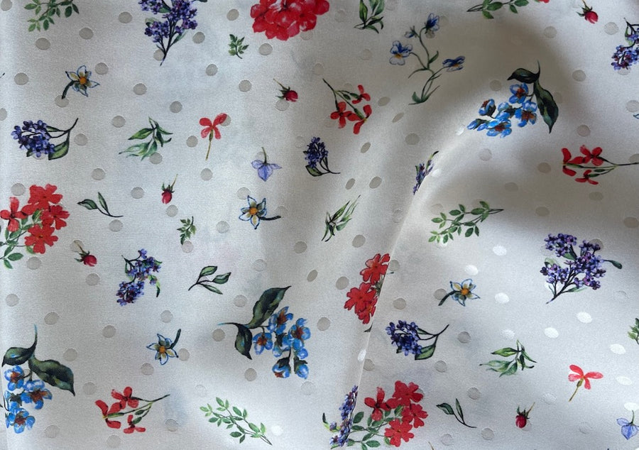 A sweet matte silk satin charmeuse jacquard of charming tumbling garden flowers and buds in lilac, sky blue, and watermelon red, and sprinkled with tone-on-tone light parchment cream jacquard dots -  this romantic silk charmeuse is perfect for a vintage-style blouse, a chic kimono, silky lounge-wear, or a summer dress. Made in Italy. 100% silk. 56" wide.
