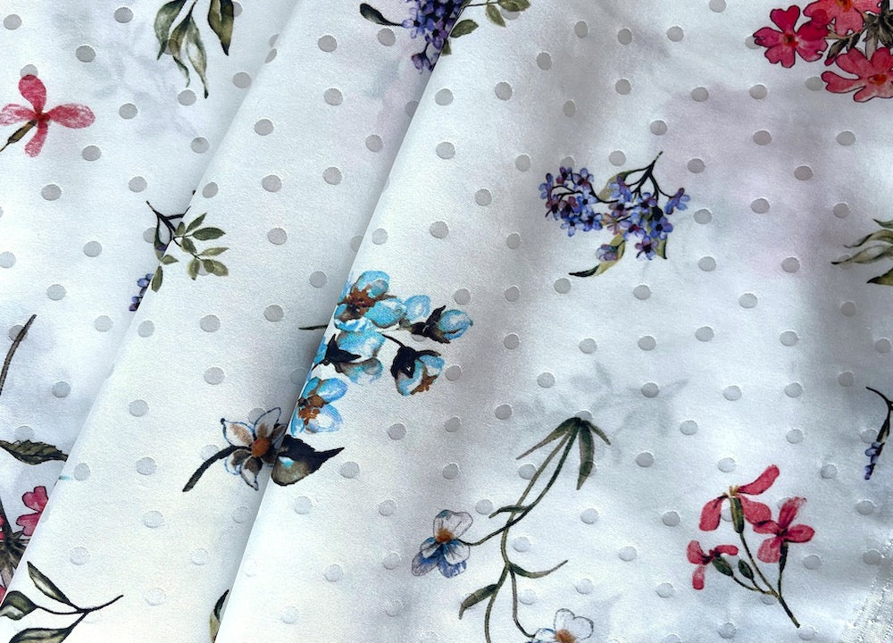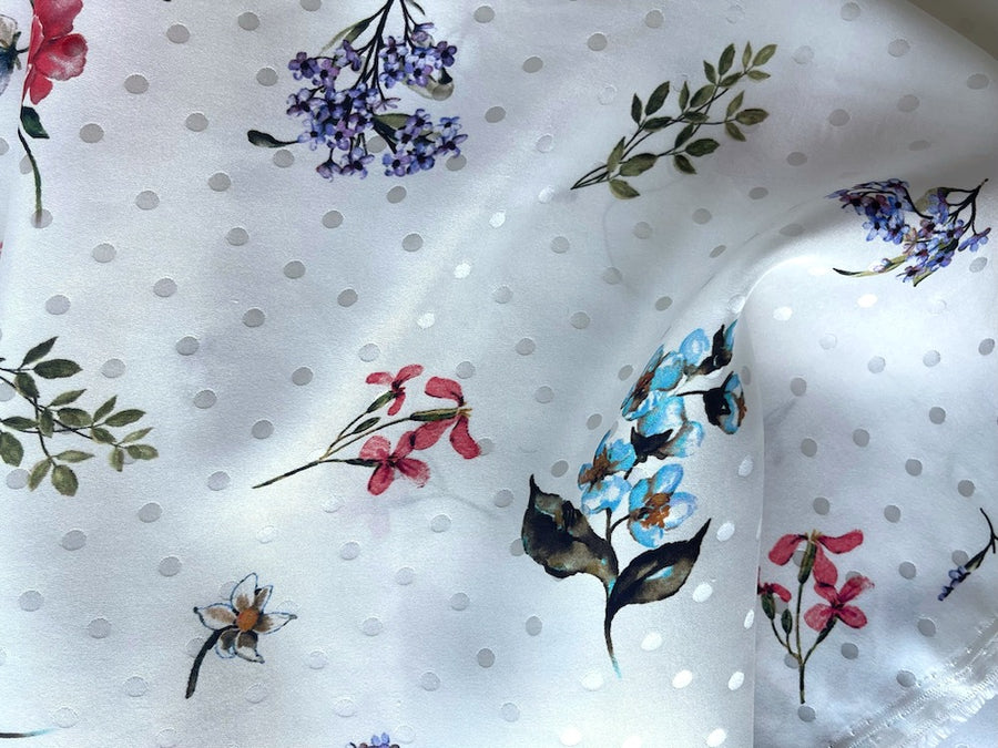 A sweet matte silk satin charmeuse jacquard of charming tumbling garden flowers in lilac, sky blue, and watermelon red, and sprinkled with tone-on-tone pale ivory jacquard dots - this romantic silk charmeuse is perfect for a vintage-style blouse, a chic kimono, silky lounge-wear, or a summer dress. Made in Italy. 100% silk. 56" wide.
