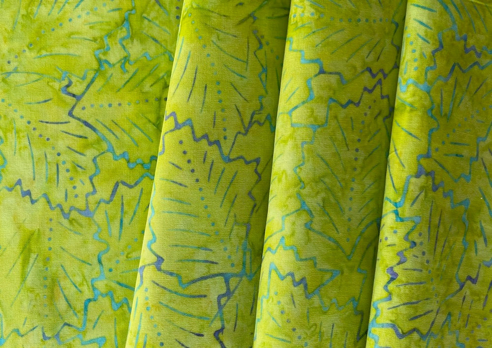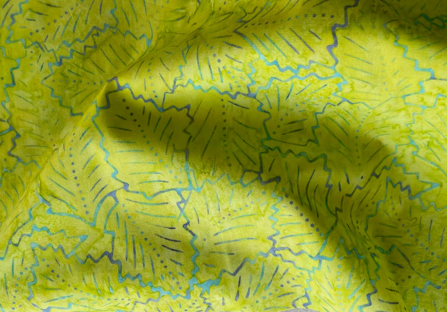 A tightly woven, soft cotton batik, with a poplin hand, in a print of chestnut oak leaves on a lime green background.