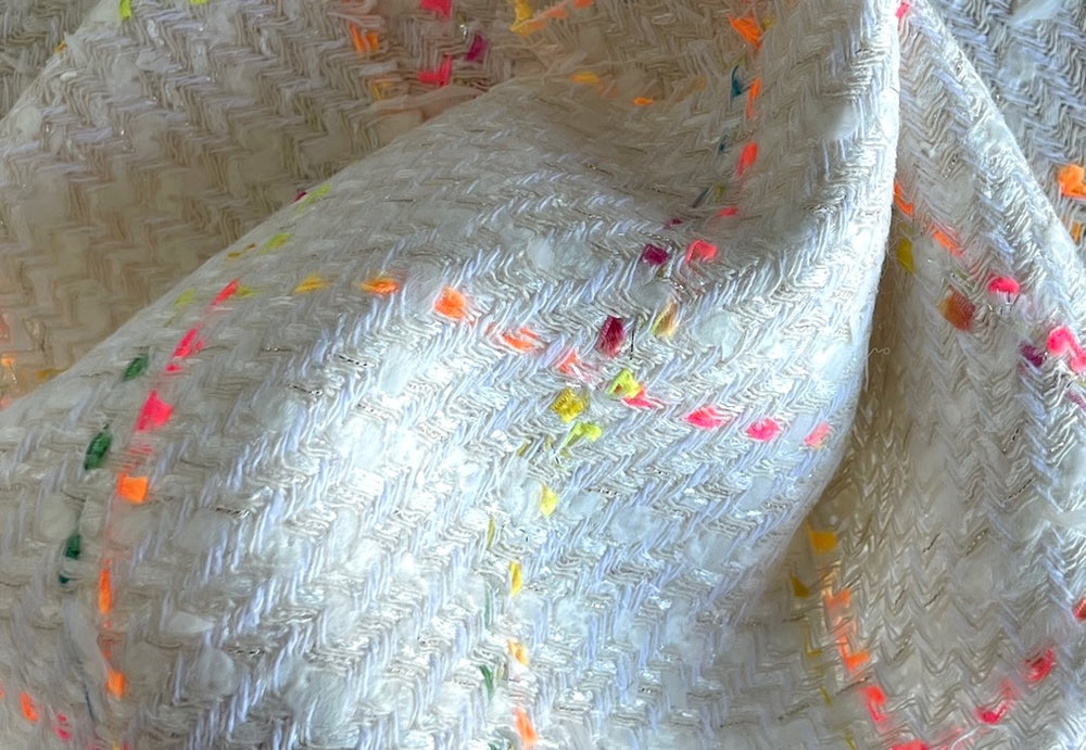 A high-end couture mid-weight cotton blend bouclé plaid suiting in shades of natural with a fluorescent windowpane check - with its delightful texture, timeless elegance, and bouncy coloration, this fabulous bouclé is perfect for a couture-style jacket, a long skirt, or a 3/4 length jacket to complement a simple sheath dress or jeans. Made in Italy for a luxury French fashion house. 50% cotton, 20% nylon, 10% rayon, 10% wool, and 10% polyester. 60” wide.