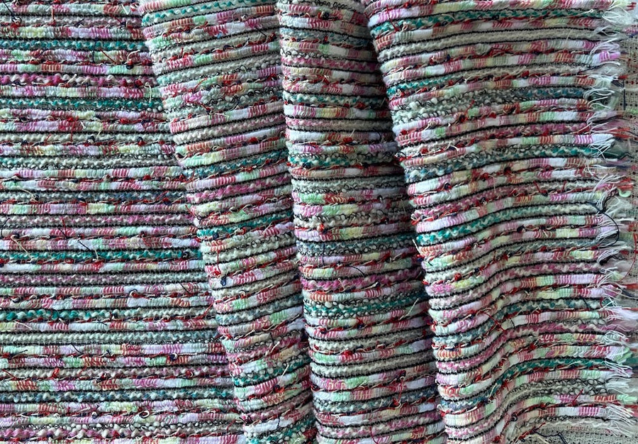 A high-end, couture mid-weight polyester blend bouclé suiting in lengthwise ribbony stripes in muted shades of cherry, turquoise, spearmint, raspberry, and white - with its delightful texture and soft coloration, this understated playful  bouclé is perfect for a couture-style jacket, a long skirt, or a 3/4 length jacket to complement a simple sheath dress or jeans. Made in Italy for a luxury French fashion house. 35% polyester, 25% acrylic, 20% nylon, 10% viscose, and 10% silk.  56” wide.