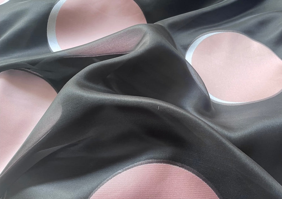 A couture sheer silk organza in a large-scale shadowbox print of 8" wide pink lemonade circles with white shadowy crescents on a jet black background - this scintillating silk organza is wonderful for a wrap, an unlined coat, or a wafting oversized blouse. Made in Italy and used by a high-end French designer. 100% silk. 58" wide.