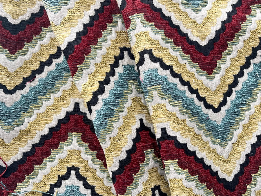 A mid-weight rayon blend mixed chenille in a cultivated scalloped flame stitch in shades of Tiffany blue, sangria, black, sea green, and sweet ivory - with a soft hand, this fabric is perfect for upholstery, accent pillows, drapes, window-seats, sofas, or headboards. Acrylic and rayon. 55" wide.