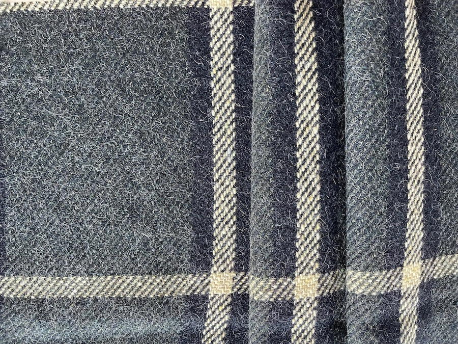 A fine, mid-weight Shetland wool in a dramatically over-sized plaid in shades of charcoal, steel, and ivory- this gorgeous, soft as butter woolen is perfect for pleated slacks, board shirts, or a cozy throw. Made in Italy and used by D&G. 100% wool. 60" wide.