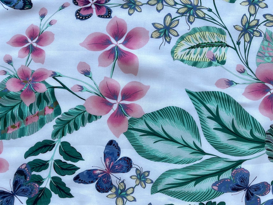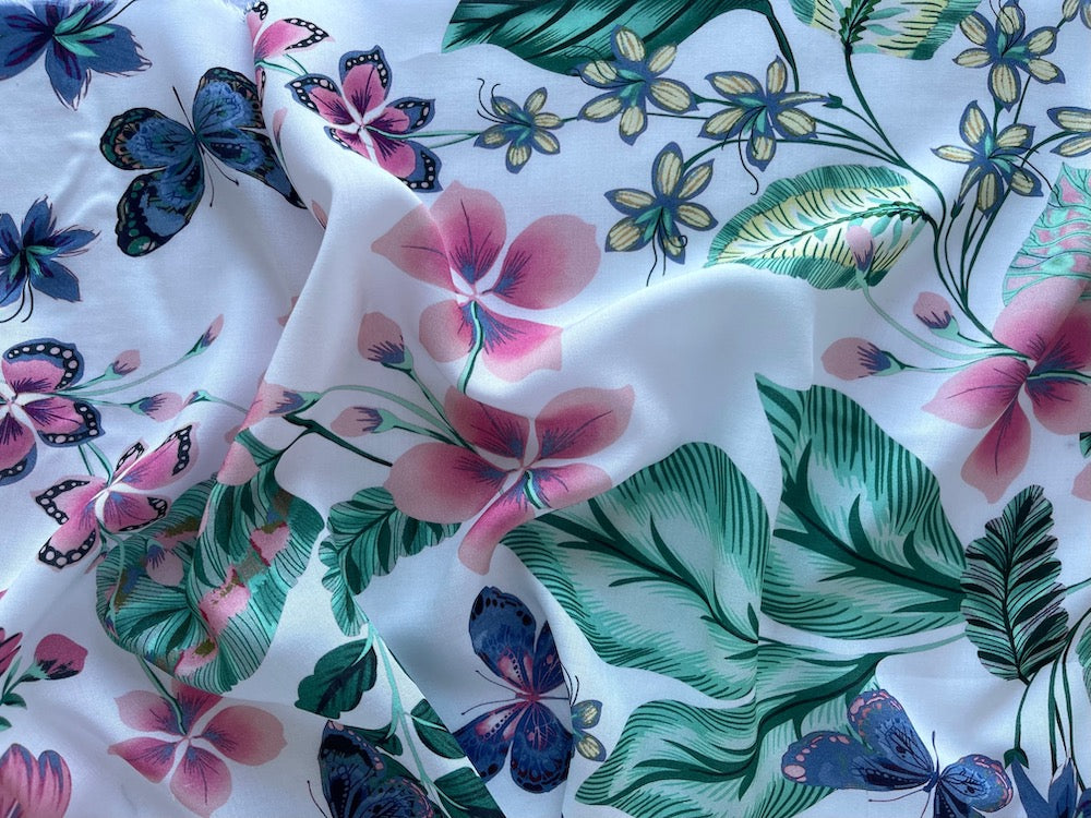 A rayon viscose challis in a delicate print of painterly springtime butterflies and blooms in shades of wintergreen, taffy pink, and slate blue on a bright white background - this soft, fluid rayon is perfect for drapey blouses, sundresses, or tank tops. Made in Italy. 100% rayon viscose. 56" wide.