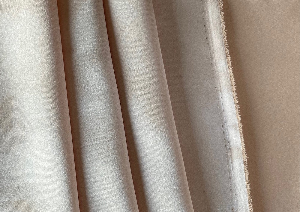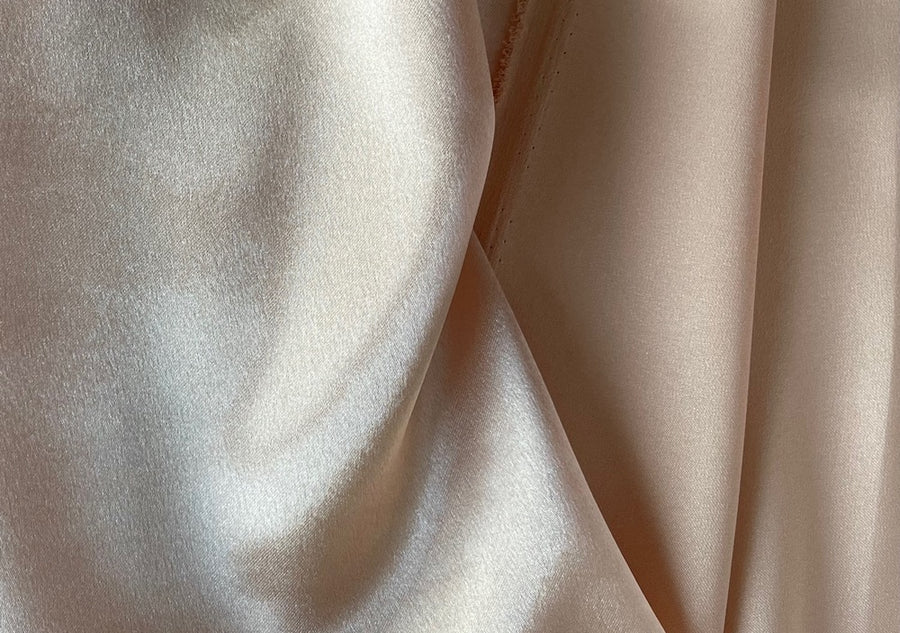 A mid-weight polyester crepe back satin in champagne - with a satin finish and a subtle pebbled texture, this drapey, washable polyester is perfect for dresses, jackets, or wide-legged pants. 100% polyester. 60" wide.