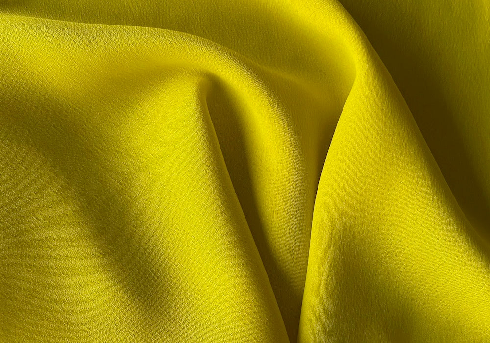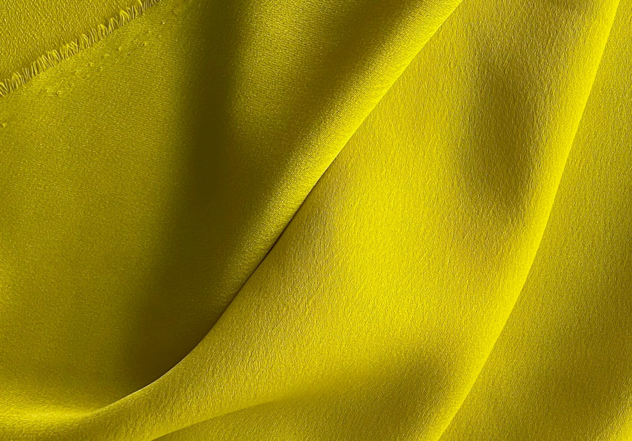 A mid-weight polyester satin crepe in electric canary sunrise yellow - fluid and with a pebbled texture, this drapey polyester is perfect for a chic wrap skirt, jackets, or slinky pants. Made in Italy . 100% polyester. 58" wide.
