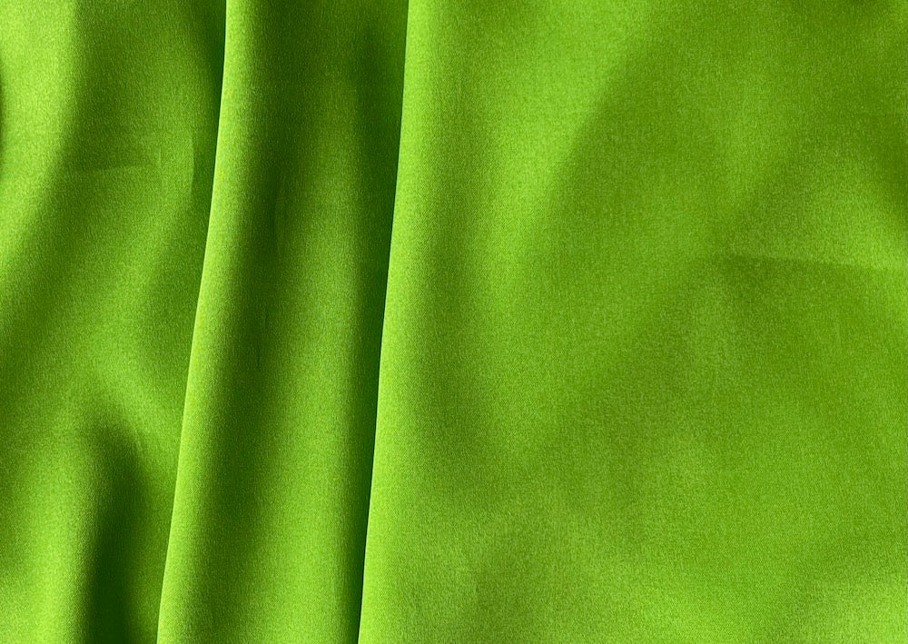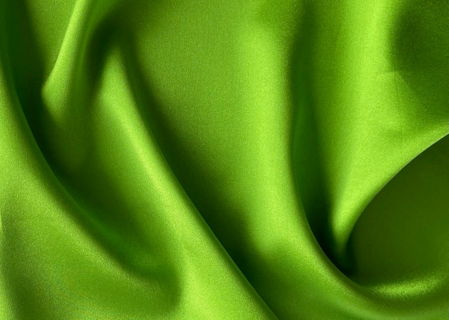 A gorgeous, high-end stretch silk satin charmeuse in electric slide lime green - with a touch of lycra for comfort, this fluid silk is perfect for blouses, lingerie, or dresses. Made in Italy. 97% silk and 3% lycra. 54" wide.