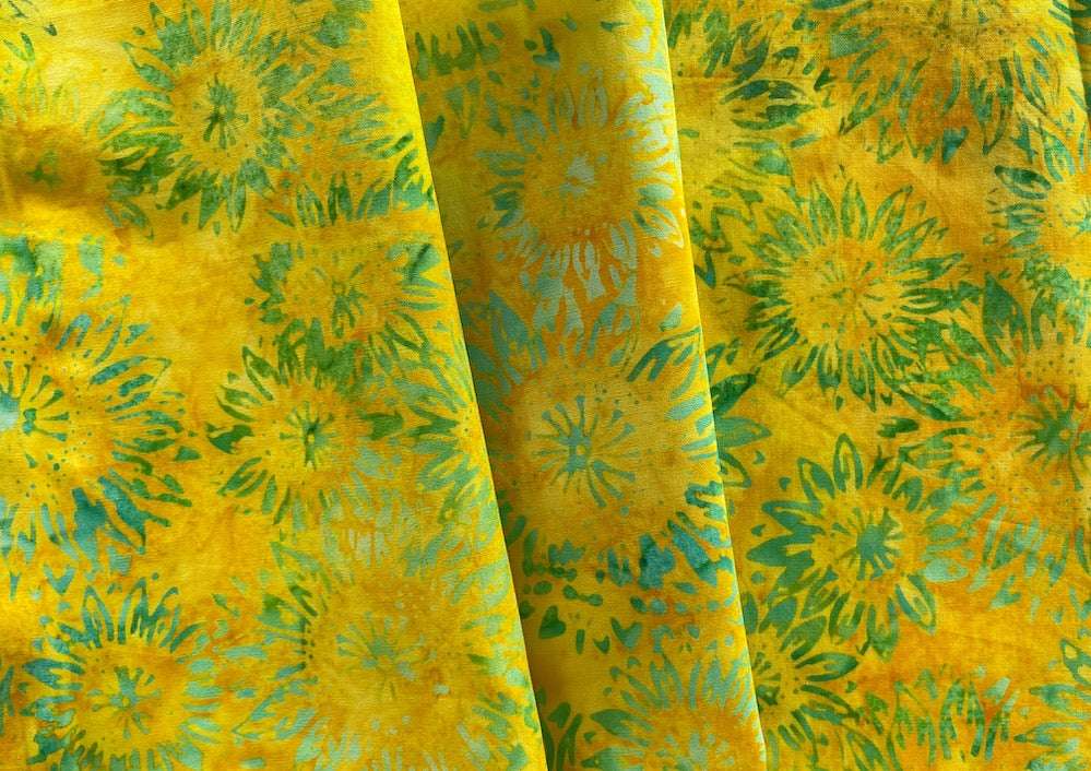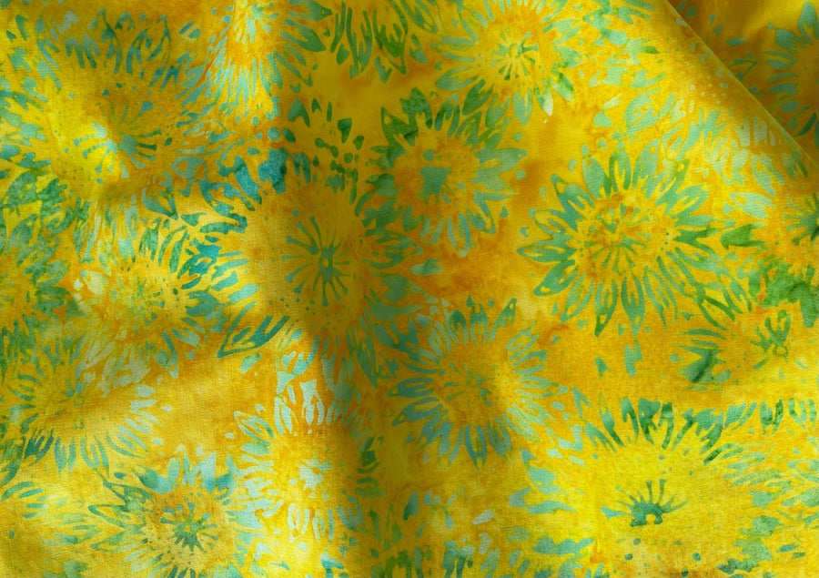A tightly woven, soft cotton batik, with a poplin hand, in a print of in a print of emerald colored sunflowers on a lemon yellow background.