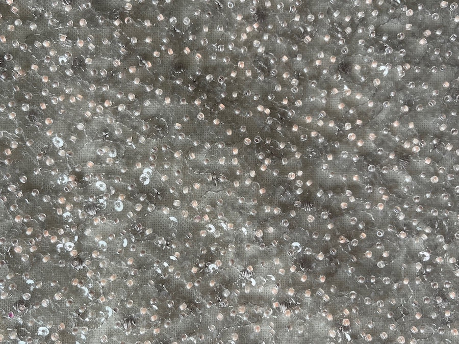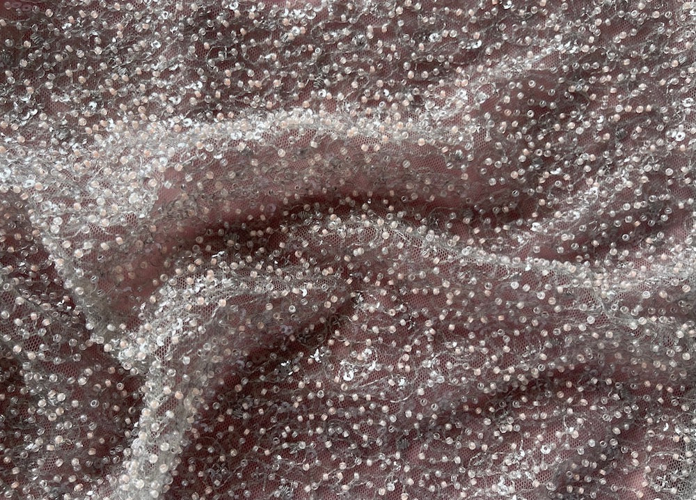 A gorgeous pale dove grey mesh sprinkled with delicate blush-colored pearls and sparkling, silvery clear sequins - this ethereal, shimmery fabric is a fairy dreamland, perfect for a top, a romantic long dress, or an elegant tunic. Made in Korea. Sequins and pearls on a mesh base. 52" wide. (In the draped shot, this fabric is pictured on a red base to show off it's glory!)