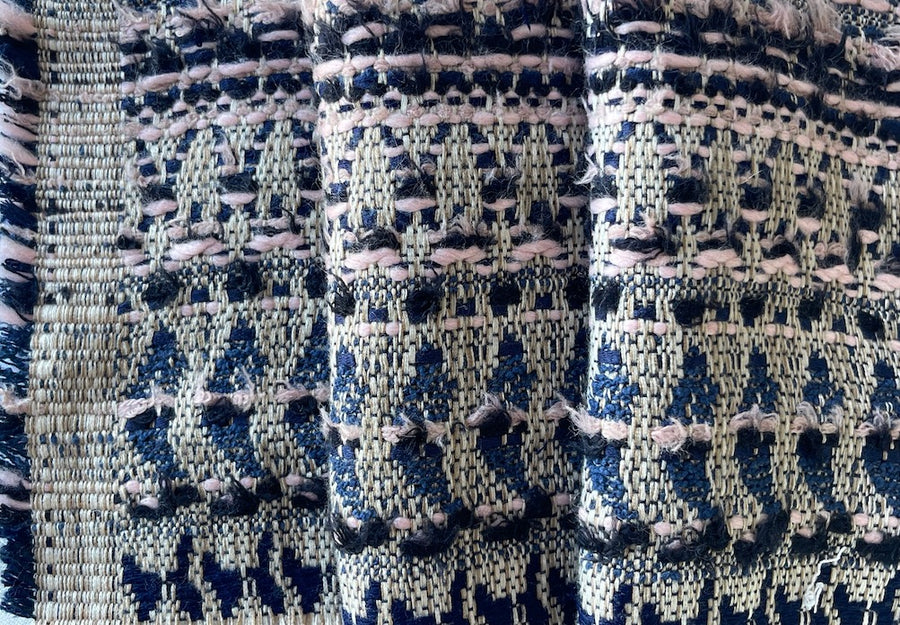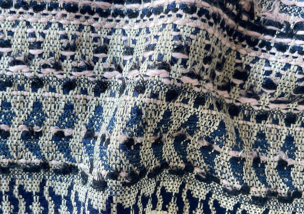 An Etro mid-weight cotton blend bouclé suiting in crosswise stripes in subtle shades of inky midnight navy, delicate rose blush, and a natural linen color - with its alluring mix of uniquely patterned stitching, this bouclé is perfect for a cropped jacket, a long skirt, or a 3/4 length jacket to complement a simple sheath dress or jeans. Made in Italy by Etro. 40% polyester, 30% cotton, and 30% acrylic. 50” wide.