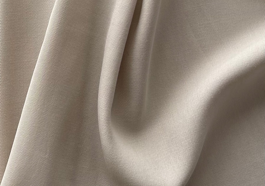 A high-end wool blend twill in chanterelle beige - supple and soft, this twill is perfect for tailored slacks, jackets, trench coats, or pleated skirts. Made in Italy and used by F Filippi. 90% wool and 10% rayon. 62" wide.