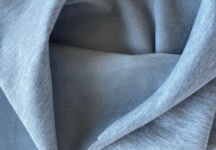 A high-end, mid-weight, double-faced cotton blend knit in heathered fog grey on one side and pearl grey suede on the reverse - with a hint of lycra, this buttery soft knit has a ponte knit feel and is great for athletic wear, sweatshirts, sporty jackets, or comfortable casual pants. Made in Italy and used by Fabiana Filippi. 50% cotton, 40% polyester, and 10% lycra. 58" wide.
