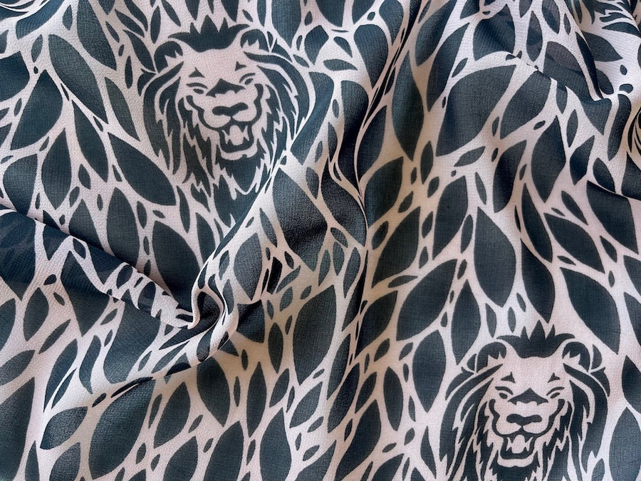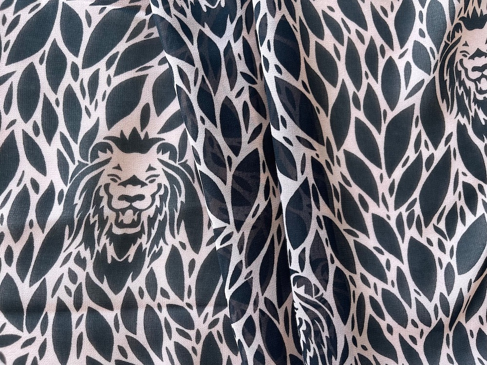 A semi-sheer polyester chiffon in a fabulous onyx and pale dusted mauve print of joyous lion heads amongst the jungle - perfect for dresses, skirts, blouses, swimsuit coverup, palazzo pants, tunics, or scarves. Made in Italy. 100% polyester. 57" wide.
