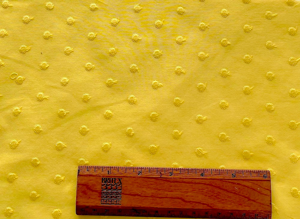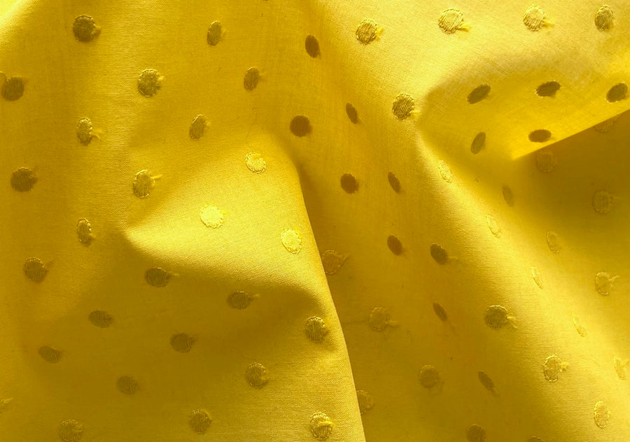 An embroidered cotton eyelet in glorious pencil yellow with cheerful polka dots - this fetching fabric is great for a flirty full skirt, a tiered sundress, or summer shorts. Made in Italy. 100% cotton. 58" wide.