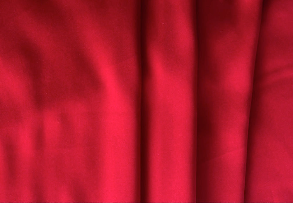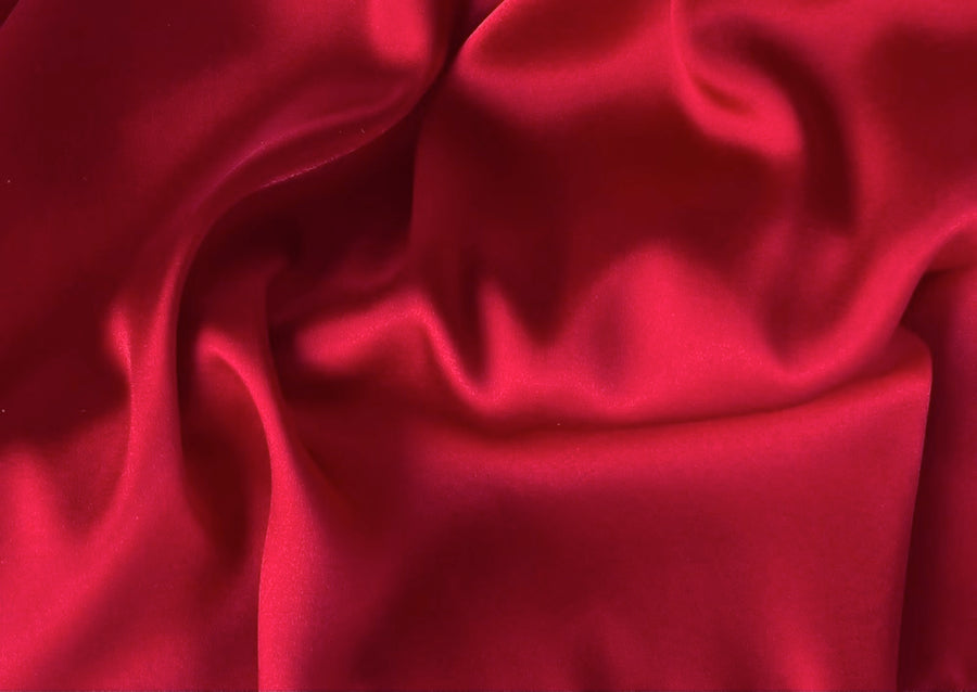 A gorgeous, high-end stretch silk satin charmeuse in an elegant shade of fiery ruby red - with a touch of lycra for comfort, this fluid silk is perfect for blouses, lingerie, or dresses. Made in Italy. 97% silk and 3% lycra. 54" wide.