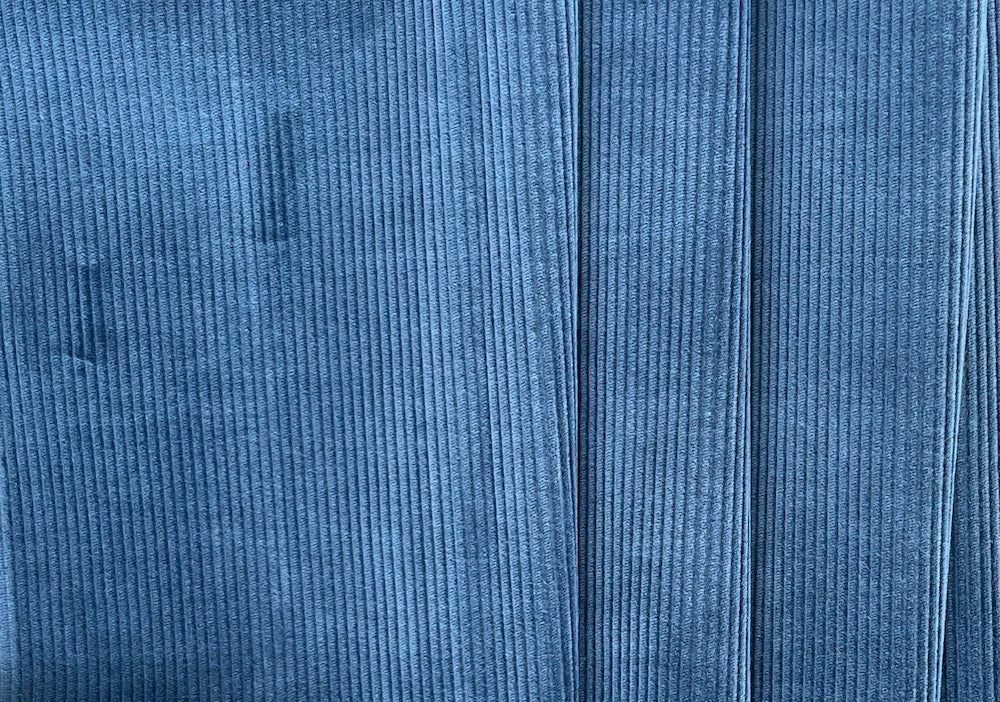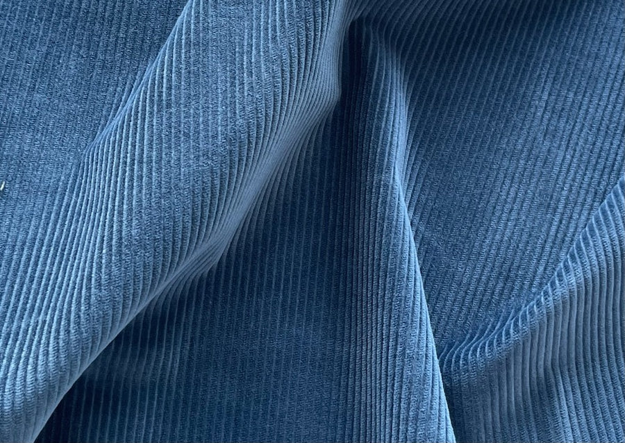 A high-end, mid-weight, stretch mid-wale cotton corduroy in French denim blue - with a touch of lycra for comfort, this buttery soft corduroy is perfect for pants, children’s wear, blouses, or full skirts. Iron on the wrong side of the fabric and with the nap, or verso del pelo. A needle board can be utilized. Made in Italy. 98% cotton and 2% lycra. 60" wide.