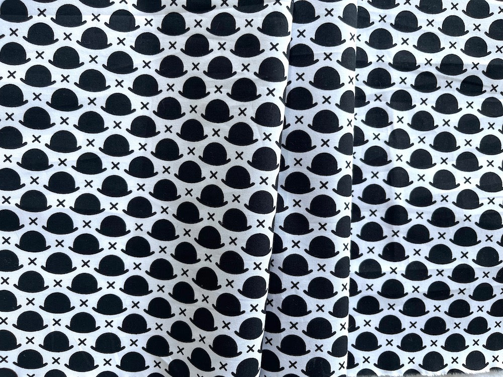 A wonderful cotton poplin in a print of handsome black bowler hats and "X" kisses on a white background - this tightly-woven poplin print is perfect for cropped pants, gathered skirts, or a sundress. Made in Italy. 100% cotton. 60" wide.