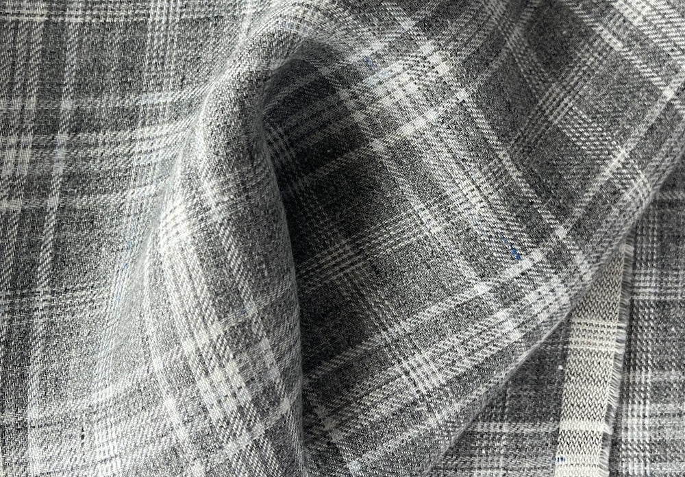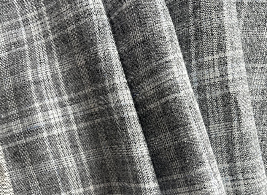 A fabulous mid-weight linen blend in a steel grey and white plaid - this soft and handsome linen is perfect for slacks, jackets, tunics, napkins, or a pleated skirt. Made in Italy. 50% linen and 50% cotton. 60" wide.