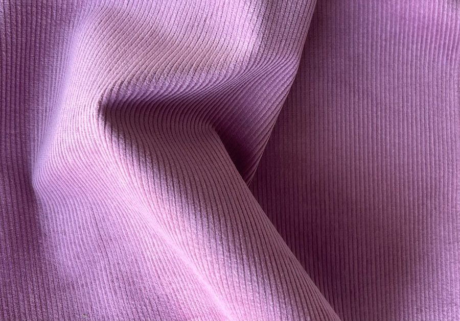 A mid-weight, narrow-wale stretch cotton corduroy in heathered mauve - with a hint of lycra for comfort, this soft corduroy is perfect for sportswear, pants, trucket jackets, or a-line skirts. Iron on the wrong side of the fabric and with the nap, or verso del pelo. A needle board can be utilized. Made in Italy. 93% cotton and 7% lycra. 59" wide.
