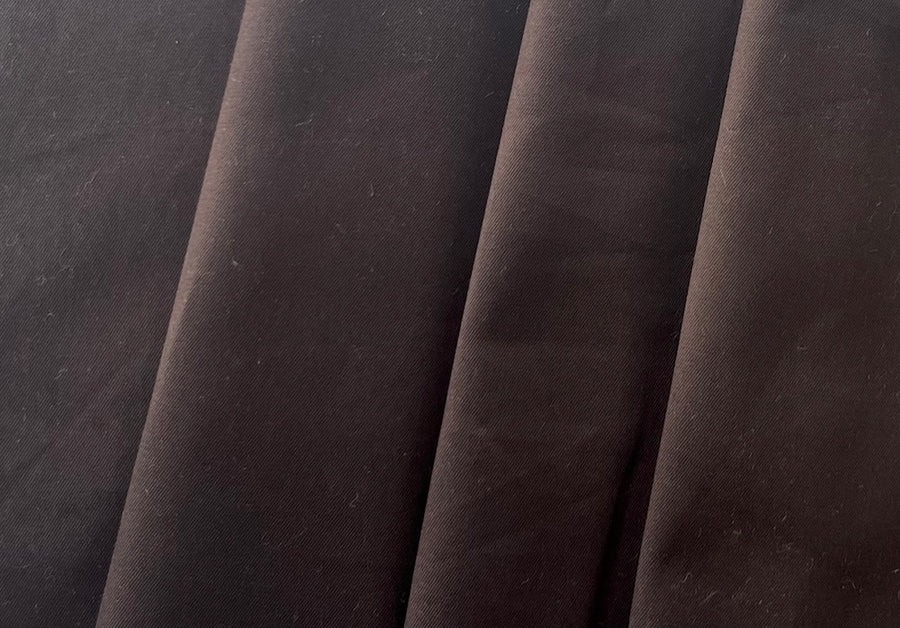 A bottom-weight, sueded cotton twill in lush milk chocolate brown - with a hint of lycra for comfort, this cotton twill is perfect for pants, trucker jackets, and coats. Made in Italy and used by Herno. 97% cotton and 3% lycra. 60" wide.
