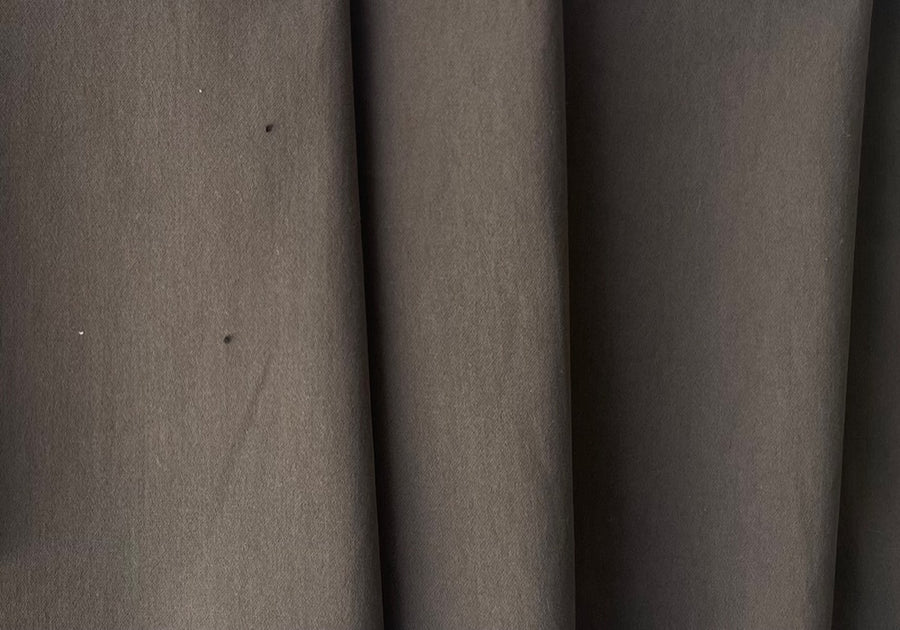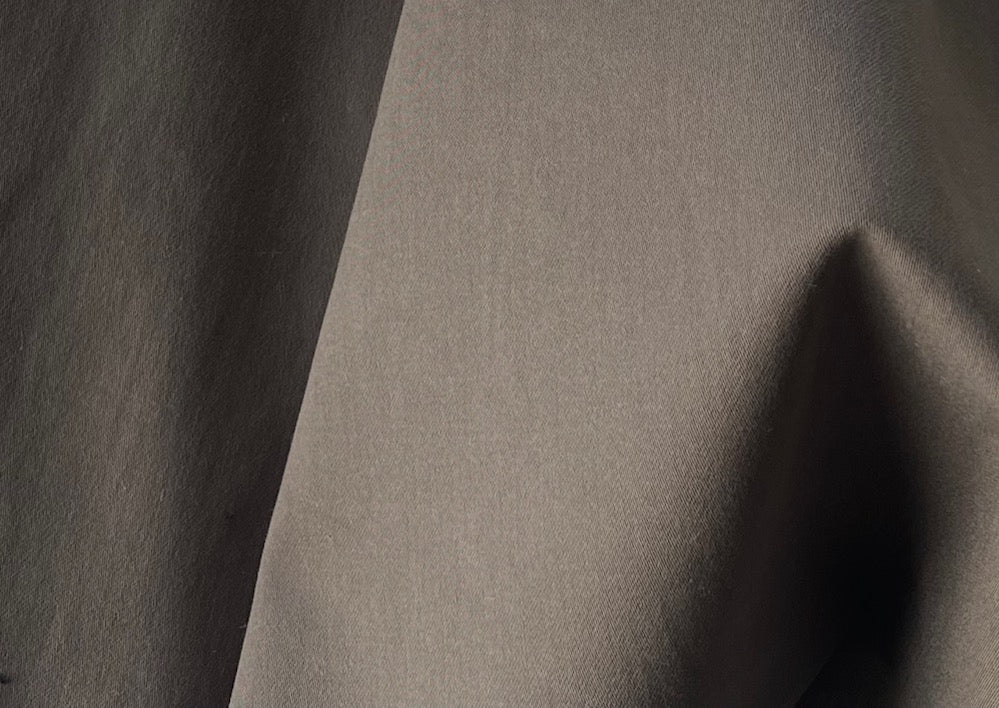 A water-resistant, bottom-weight, sueded cotton twill in cool umber mushroom - with a hint of lycra for comfort, this high-end cotton twill is perfect for pants, trucker jackets, coats, and rainwear. Made in Italy and used by Herno. 97% cotton and 3% lycra. 60" wide.