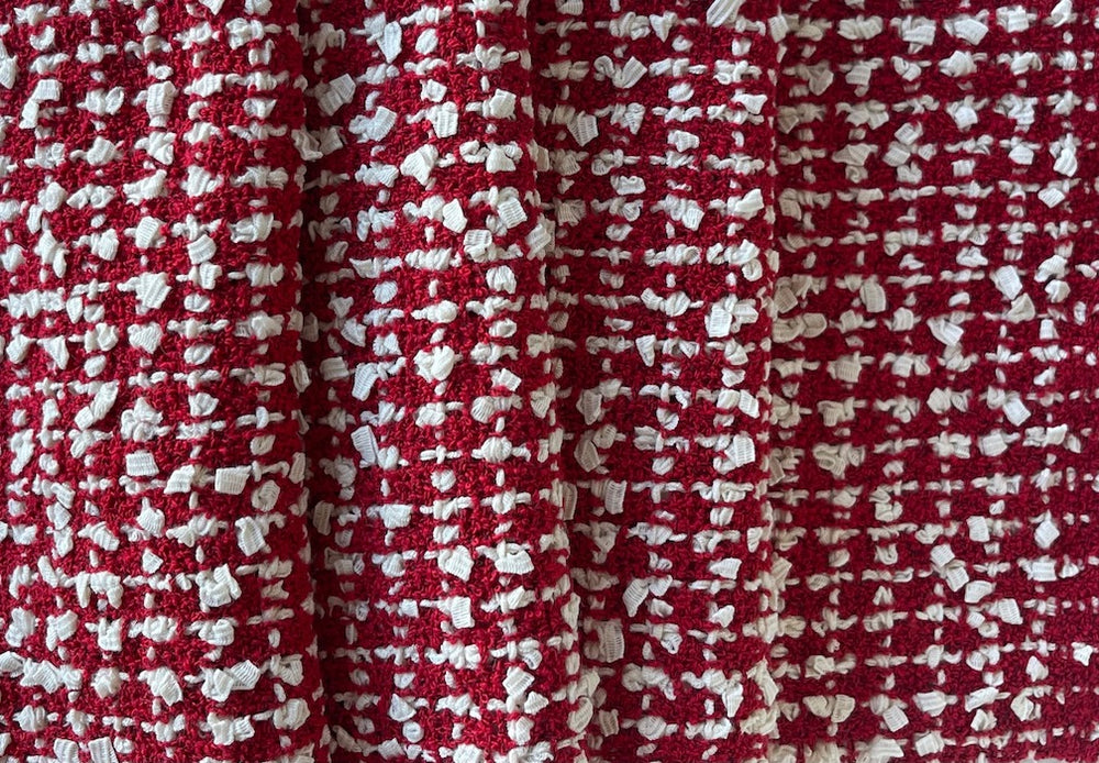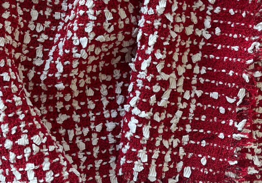 A high-end, couture mid-weight cotton blend tweedy bouclé in shades of rich ruby and cool snow - with its delightful texture and timeless elegance, this soft, fabulous bouclé is perfect for a couture-style jacket, a long skirt, a sheath dress, or a 3/4 length jacket to complement a simple sheath dress or jeans. Made in Italy for a luxury French fashion house. 80% cotton, 20% acrylic, and 10% nylon. 58” wide.