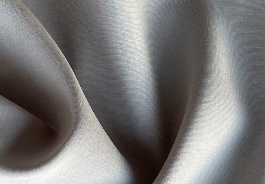A high-end, mid-weight sueded cupro challis in moonlit pearl grey this drapey, matte cupro is cool to the touch, washable, and with a similarity to sueded silk charmeuse. It's perfect for work or travel garments, pants, dresses, or blouses. Made in Italy. 100% cupro (rayon base). 59" wide.