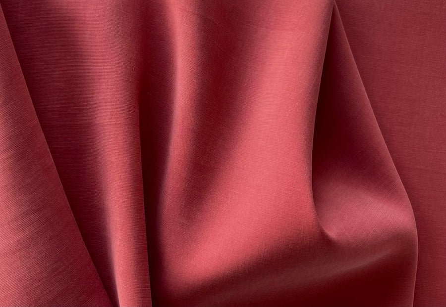 A high-end, mid-weight sueded cupro challis in terra cotta red - this drapey, matte cupro is cool to the touch, washable, and with a similarity to sueded silk charmeuse. It's perfect for work or travel garments, pants, dresses, or blouses. Made in Italy. 100% cupro (rayon base). 56" wide.