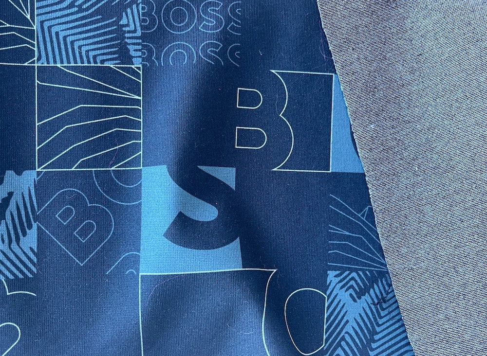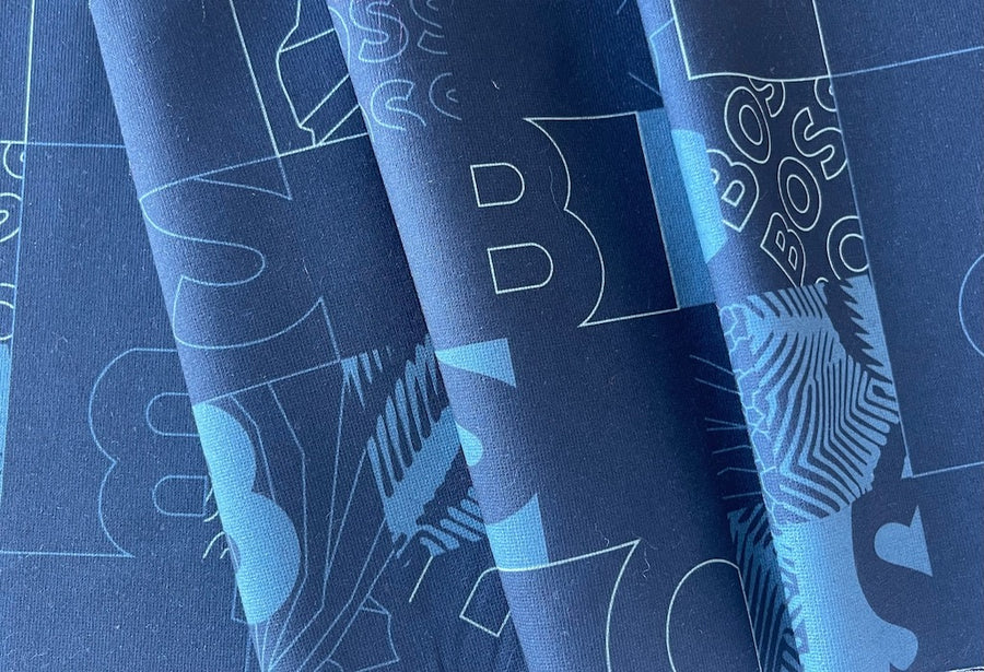 A designer mid-weight signature cotton blend ponte doubleknit in with grid pattern with variations and abbreviations of Hugo Boss's name in navy and slate blues - with a hint of lycra, this stable knit is great for skirts, jackets, pants, hoodies, or tunics. Made in Italy for Hugo Boss. 90% cotton and 10% lycra. 65" extra wide.