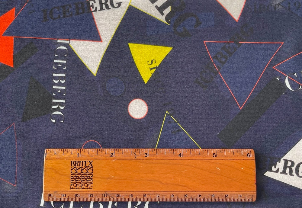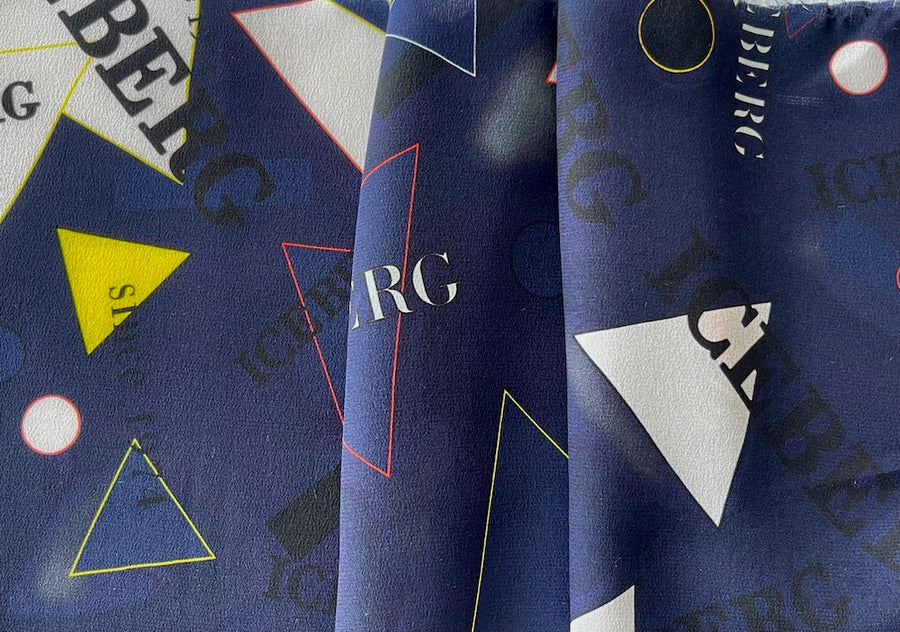 A designer silk crepe de chine in an Iceberg sportif signature geometric print in shades of punchy yellow, scarlet, and white on an admiral navy background - this quirky silk is perfect for blouses, dresses, or linings. Signature print made in Italy for Iceberg. 100% silk. 54" wide.